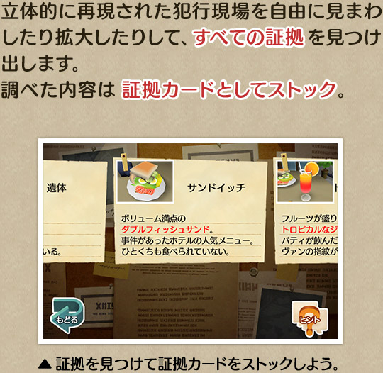 立体的に再現された犯行現場を自由に見まわしたり拡大したりして、すべての証拠を見つけ出します。調べた内容は証拠カードとしてストック。 証拠カードとしてストック