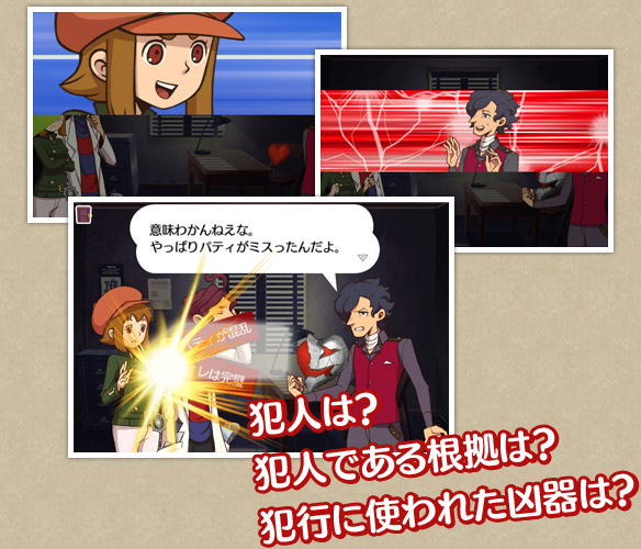 証拠が揃ったら 容疑者と最終対決。事件現場に残された証拠や 証人の発言をもとに、犯人を問い詰めていきます。事件を解明に導きましょう。